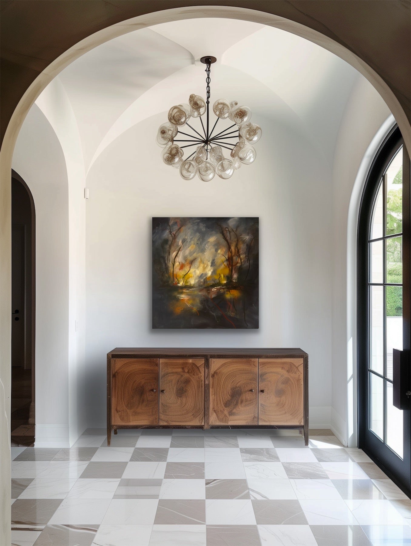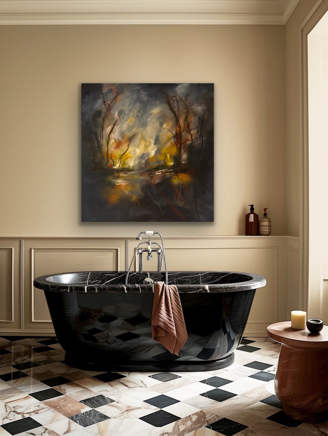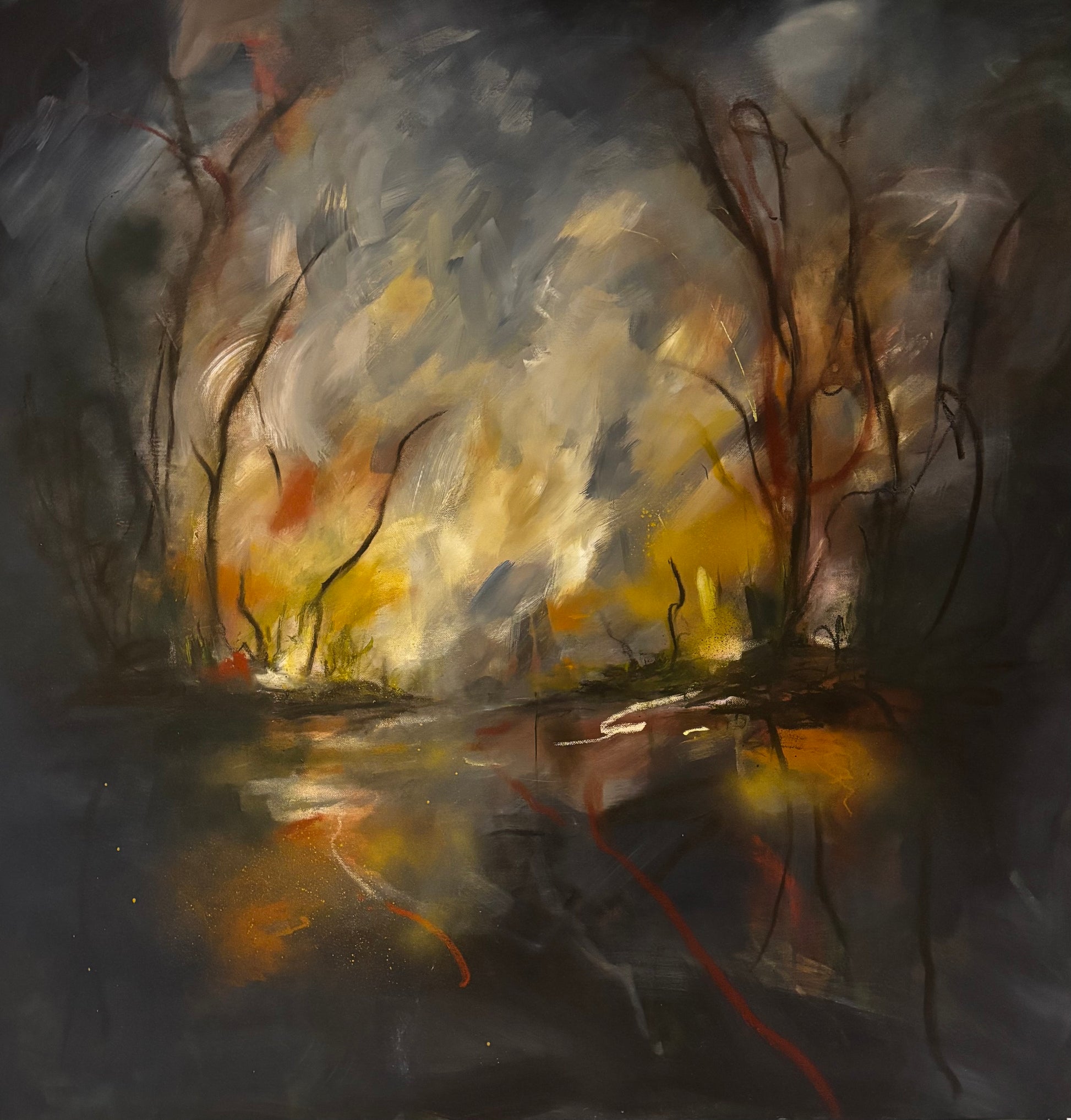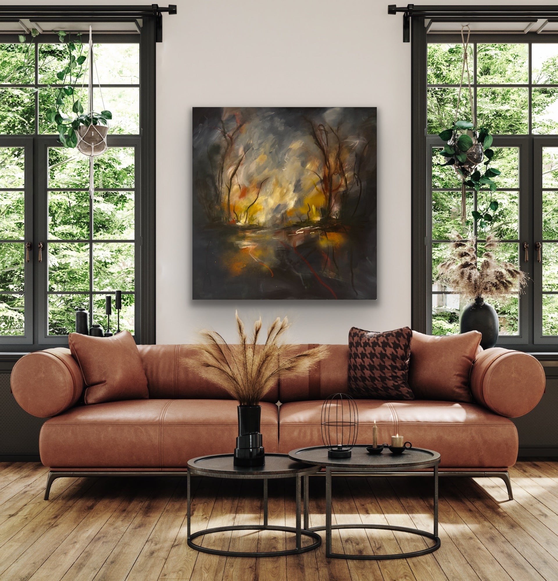 This 100 x 100 cm deep edge canvas creates depth in its application of oil and acrylic, creating a sophisticated interplay of reflective surfaces and tonal depth. The composition achieves a rare balance between reality and abstract, with the autumnal palette functioning both as subject matter and psychological anchor. Its soulful quality is found through the gestural marks and layering methods that invite long viewing. The earthly colours can fit almost any space. This is a unique piece that there will never be any prints or copies of.